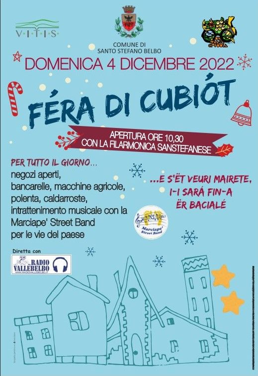 Anche quest’anno torna, a Santo Stefano Belbo, la tradizionale “Fèra di Cubiòt”, promossa dal Comune di Santo Stefano Belbo, in collaborazione con l’Associazione Vitis: cibo, musica e tradizioni tornano a essere protagonisti domenica 4 dicembre, per tutta la giornata, facendo rivivere le antiche usanze del mercato santostefanese che un tempo si svolgeva puntualmente ogni 6 dicembre.