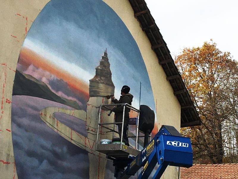 Autore di circa cento grandi lavori, gli ultimi due realizzati di recente in Russia e Georgia, l'artista ha scelto il tema della conchiglia dopo aver visitato il Museo Paleontologico di Asti. Prima di mettersi al lavoro ha fatto uno studio accurato, andando a osservare dall'alto il paese per cogliere i colori autunnali della terra e riportarli con i pennelli sul grande muro, realizzando un'immagine onirica dotata di profondità e prospettiva. La parte sinistra più illuminata di quella destra: "E' quella dove batte il sole, ho voluto rispettare fedelmente lo stato naturale delle cose" dice l'artista, che ha creato l'opera in pochi giorni su un'autoscala, ascoltando musica in cuffia.