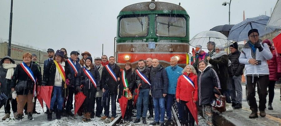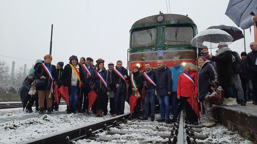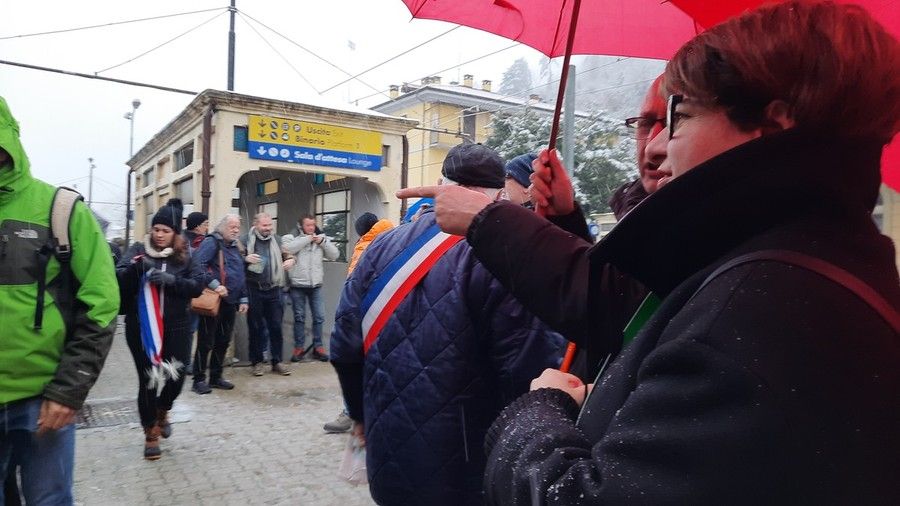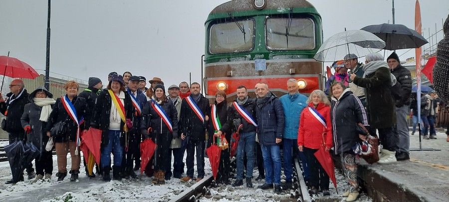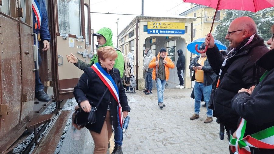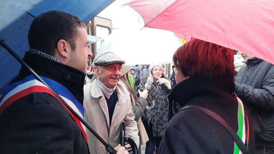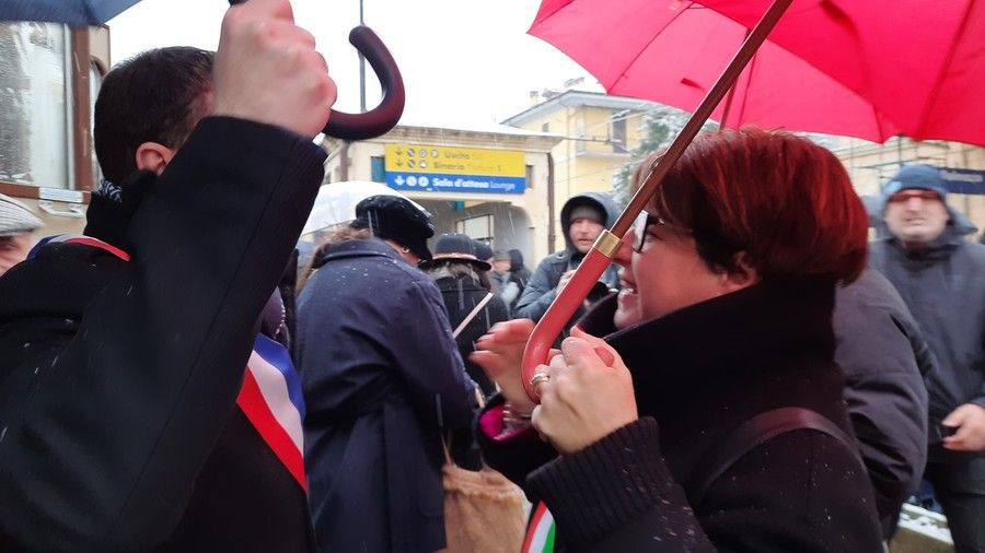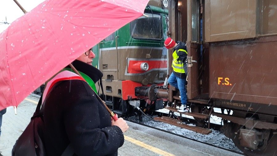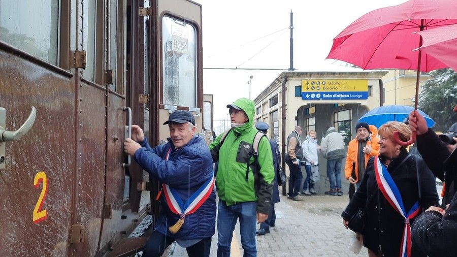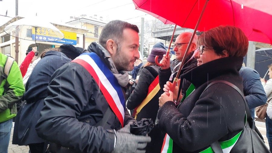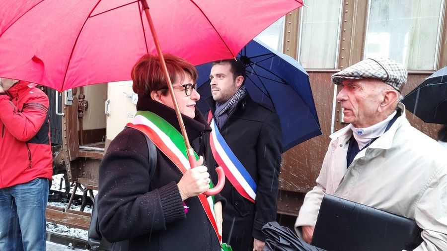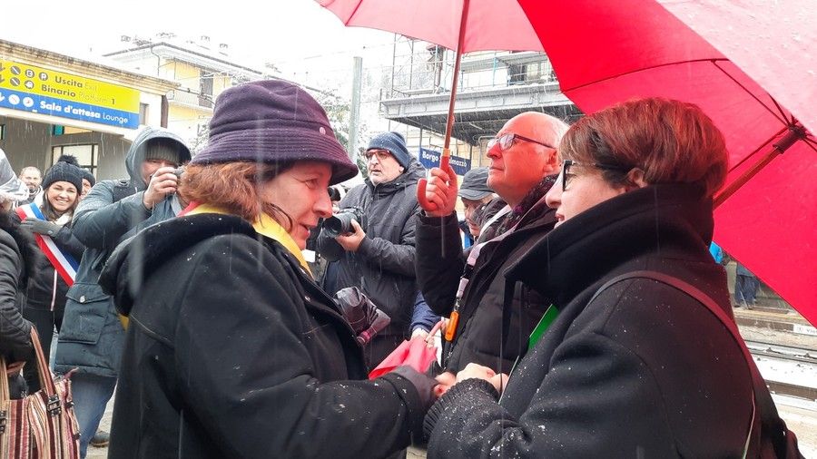 La sindaca di Borgo Roberta Robbione ha accolto sul terzo binario il collega di Breil Sébastien Olharan, sceso dal treno storico insieme a tutti i primi cittadini della Val Roya.