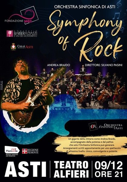 Domani sera, dalle 21, il Teatro Alfieri di Asti ospiterà l’appuntamento conclusivo con la settima edizione del “Monferrato On Stage” – rassegna itinerante volta a valorizzare e a far conoscere sempre più il territorio del Monferrato alla popolazione locale e ai turisti, attraverso una serie di eventi in cui la musica incontra il mondo enogastronomico – che vedrà sul palco dei protagonisti davvero d’eccezione. Ovvero l’Orchestra Sinfonica di Asti e il chitarrista Andrea Braido (‘storico’ chitarrista di Vasco Rossi e collaboratore di numerosi altri protagonisti del panorama musicale italiano), che porteranno in scena “Symphony of ROCK”, un innovativo e coinvolgente spettacolo in cui la musica sinfonica si fonde con il rock.