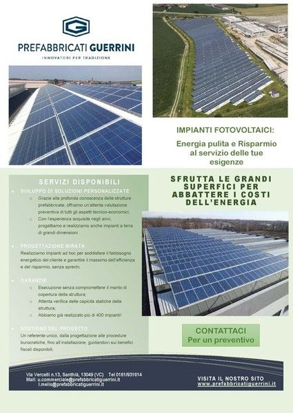 Da più di dieci anni l’azienda Prefabbricati Guerrini realizza Impianti Fotovoltaici sulle strutture industriali, commerciali, logistiche e rurali di propria fornitura e/o già esistenti. Le piccole, medie e grandi superfici di copertura vengono utilizzate per la produzione di energia pulita, contribuendo così in modo sostanziale allo sviluppo energetico ecosostenibile e al risparmio dei costi energetici di ogni realtà aziendale.