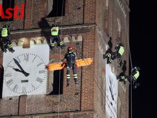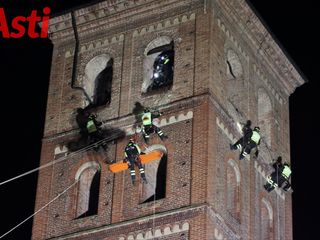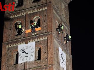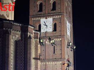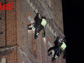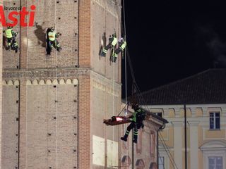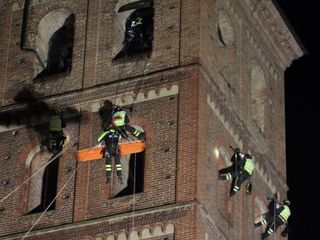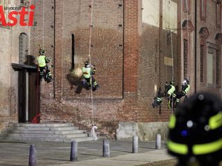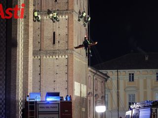 Vigili del fuoco inerpicati sulla torre della splendida Cattedrale di Asti per una suggestiva esercitazione Saf (Speleo Alpinistica e Fluviale).