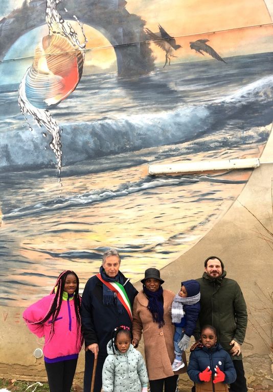 Il murale con la grande conchiglia emerge con forza sulla parete esterna della Casa di Accoglienza madre-bambino all'ingresso del paese e tutt'intorno c'è una coltre bianca che rende ancora più vividi i colori dell'opera. Il ponte che spicca dall'acqua con il paese di Castellero rappresenta il naturale collegamento tra il passato/presente del territorio e i vissuti delle persone, da qualsiasi angolo del mondo provengano. Lo ha spiegato lo stesso artista nell’ambito dell’inaugurazione svoltasi ieri, mentre i bambini nigeriani, accolti con le loro mamme nel centro gestito dal Piam, giocavano incuranti in mezzo a sindaci e cittadini.