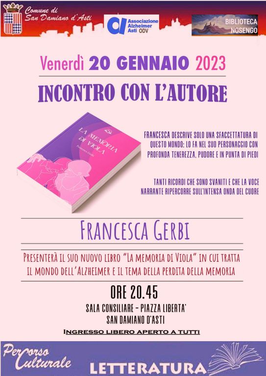 Venerdì 20 gennaio la giornalista e scrittrice Francesca Gerbi presenterà la sua nuova delicata opera: "La memoria di Viola", viaggio nell'Alzheimer e la perdita di memoria, così destabilizzante per chi la vive e le famiglie.