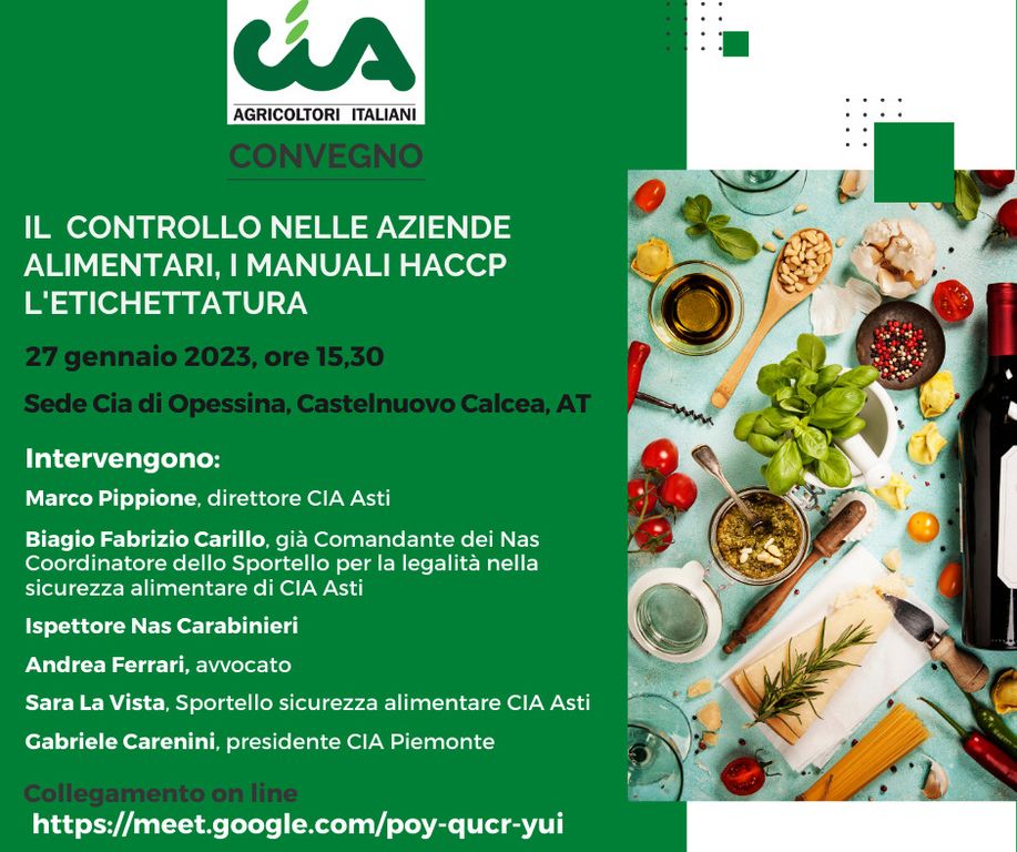 Venerdì 27 gennaio si parlerà di controlli in cantina, etichettatura e manuali Haccp nel convegno/seminario (in presenza e online) organizzato da Cia Asti presso la sede di Opessina-Castelnuovo Calcea. A partire dalle 15,30 interverranno Biagio Fabrizio Carillo, già comandante dei Nas dei Carabinieri e responsabile dello Sportello Cia per la sicurezza alimentare, l’ispettore dei Nas Vito Garofalo, l’avvocato Andrea Ferrari, Sara La Vista dello Sportello Cia, il direttore provinciale Marco Pippione e il presidente regionale Gabriele Carenini.
