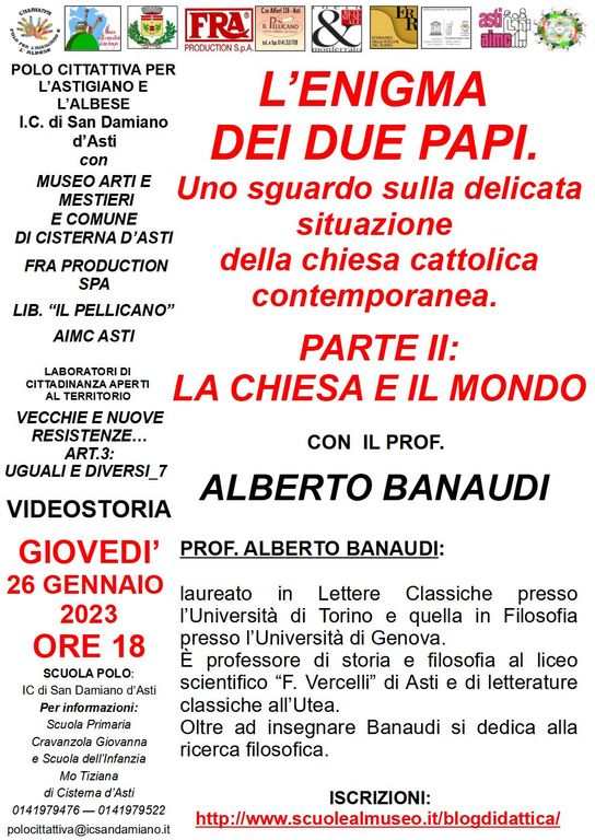 Giovedì 26 gennaio alle 18, si terrà la nuova videostoria con il prof. Alberto Banaudi “L’enigma dei due Papi. Uno sguardo sulla delicata situazione della Chiesa Cattolica contemporanea. Parte II: La Chiesa e il mondo”.