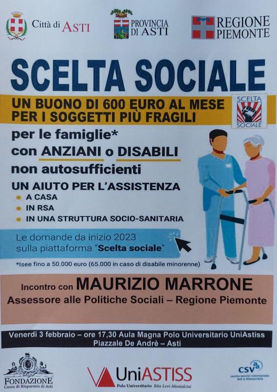 “Nell’aula Magna del Polo universitario Uniastiss l'assessore regionale alle Politiche sociali Maurizio Marrone ha illustrato ‘Scelta sociale’, come accedere al portale per usufruire del contributo mensile destinato alle persone anziane non autosufficienti e ai disabili”: è quanto scrive il sindaco di Castelnuovo Belbo Aldo Allineri.