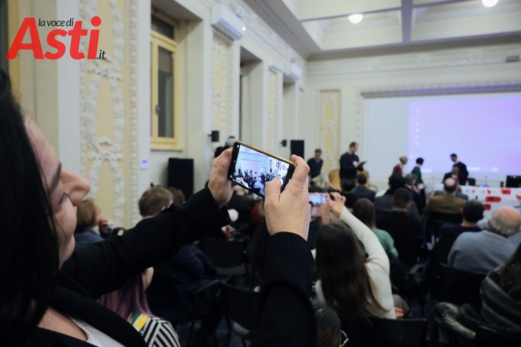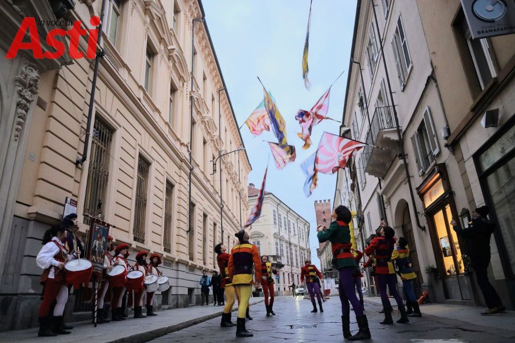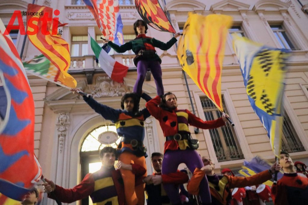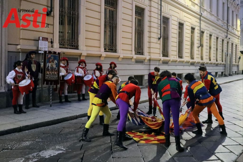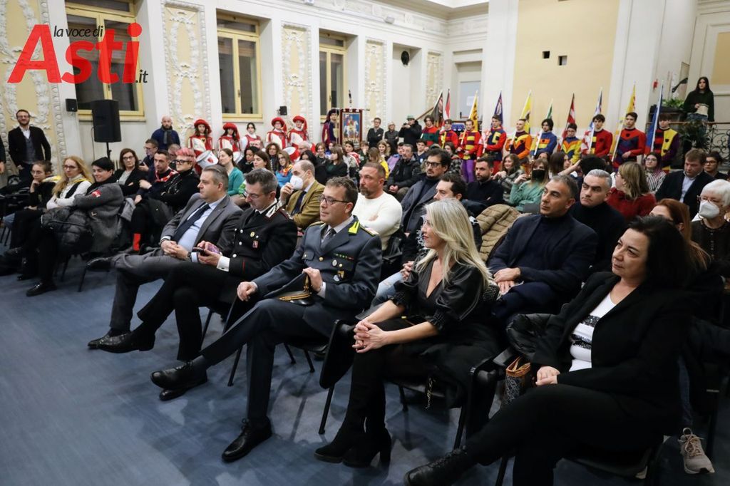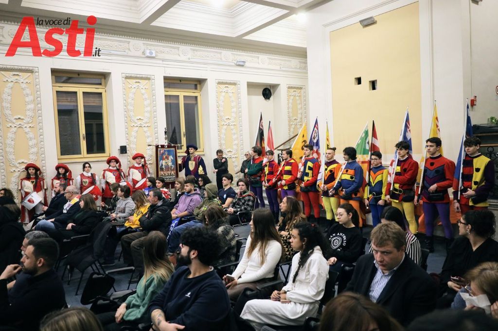 Prima dell'incontro, esibizione degli sbandieratori dell'Asta. Diversi ragazzi presenti ma soprattutto collegati online, in sala anche diversi Rettori, il Capitano del Palio Filippone, l'assessore al Palio Origlia e autorità.