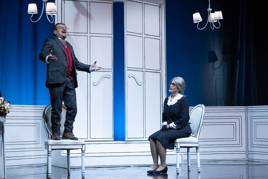 La coppia litiga – con ferocia ma anche con molta tenerezza – trascorrendo un’ora e mezza in un ‘inseguimento poetico’ con lui che cerca di sfuggire all’ineluttabile realtà e lei che cerca di riportarcelo.