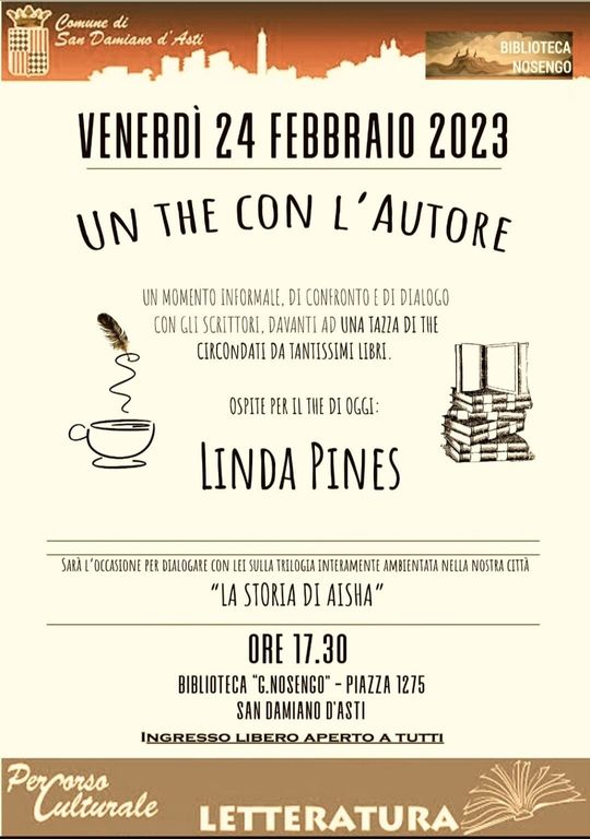 La scrittrice Linda Pines, che vive proprio in paese, presenterà il suo libro "Storia di Aisha", alla Biblioteca "G. Nosengo" di piazza 1275, venerdì 24 febbraio alle 17.30.