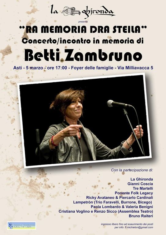“Ra memoria dra steila” è il titolo del concerto/incontro in memoria di Betti Zambruno, morta a dicembre 2022, che si terrà domenica 5 marzo alle ore 17 presso il Foyer delle famiglie in Via Milliavacca 5 ad Asti.