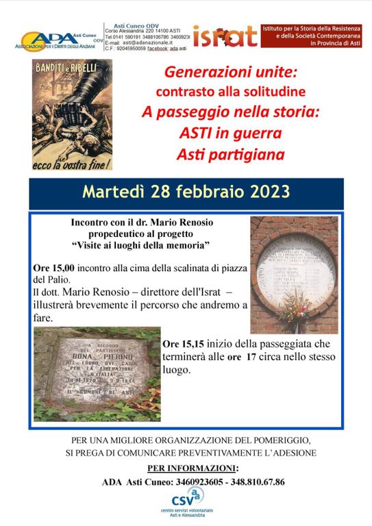 Il prossimo incontro dell'associazione si svolgerà martedì 28 febbraio, con la visita "all'Asti in guerra, Asti partigiana".