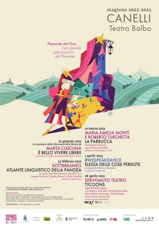 Dal 28 marzo inaugurerà inoltre la sezione di cartellone del Teatro Scuola, che vedrà il coinvolgimento di tutte le scuole canellesi. La programmazione si concluderà venerdì 28 aprile con lo spettacolo “Tycoons” della compagnia Servomutoteatro, con drammaturgia e regia di Michele Segreto: una novità italiana nell’ambito di NEXT – Laboratorio delle idee per la produzione e la distribuzione dello spettacolo dal vivo, nell’edizione 2022/2023.