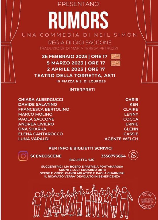 Domenica 2 aprile alle 17 al Teatro della Torretta di Asti andrà in scena la replica dello spettacolo "Rumors", di SceneOscene, una commedia brillante di Neil Simon, per la regia di Gigi Saccone. Traduzione di Maria Teresa Petruzzi.