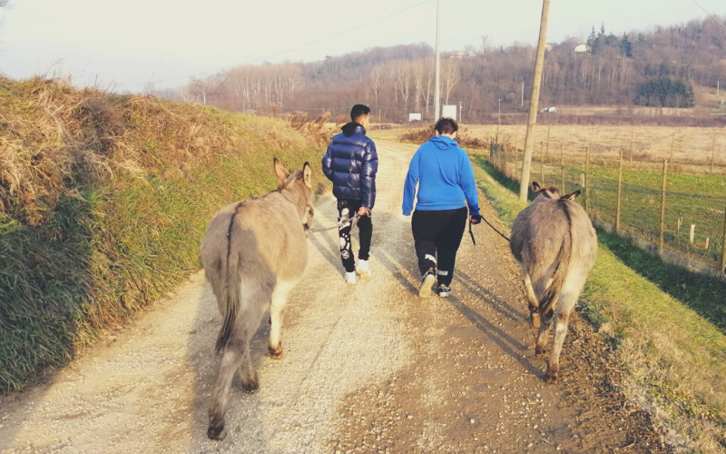 Ciccio e Arturo, i due asinelli della cooperativa, con due ragazzi ospiti
