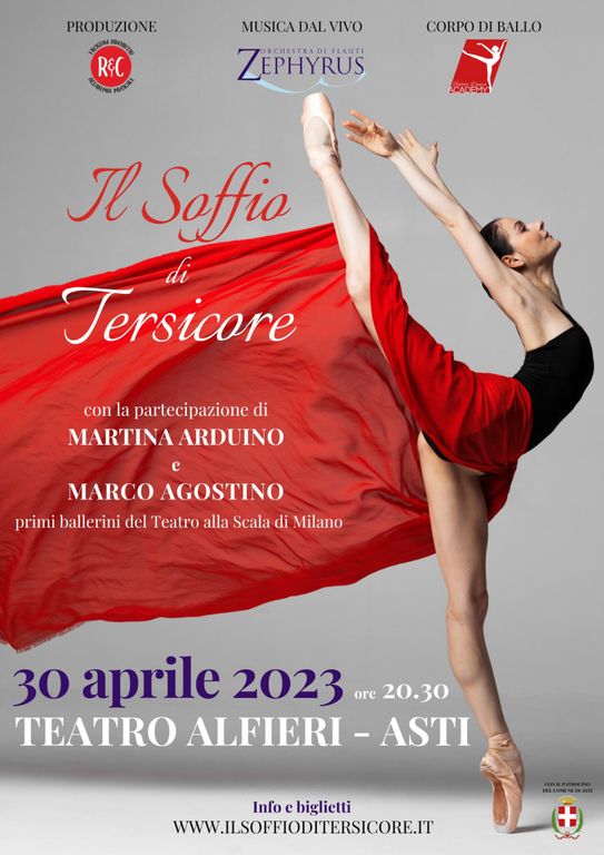 Domenica 30 aprile Tersicore, Musa della danza, ‘apparirà’ al Teatro Alfieri di Asti con la messa in scena dello spettacolo “Il soffio di Tersicore”. In molte religioni il respiro è il simbolo dello spirito vitale (pneuma), qui espresso come elemento sostanziale del suono grazie al prezioso apporto di una orchestra interamente composta da strumenti a fiato, il che la rende una formazione unica in Italia.