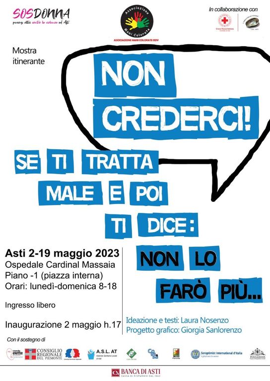 "Non crederci!", come l'edizione 2023 di SOS donna, ha il sostegno del Consiglio regionale, con la Consulta delle Elette e la Consulta Femminile, Asl AT, Cisa Asti Sud, Cogesa, Anci Piemonte, Soroptimist Club di Asti, Fondazione CRAT, Banca di Asti, i cui rappresentanti sono attesi all'inaugurazione.