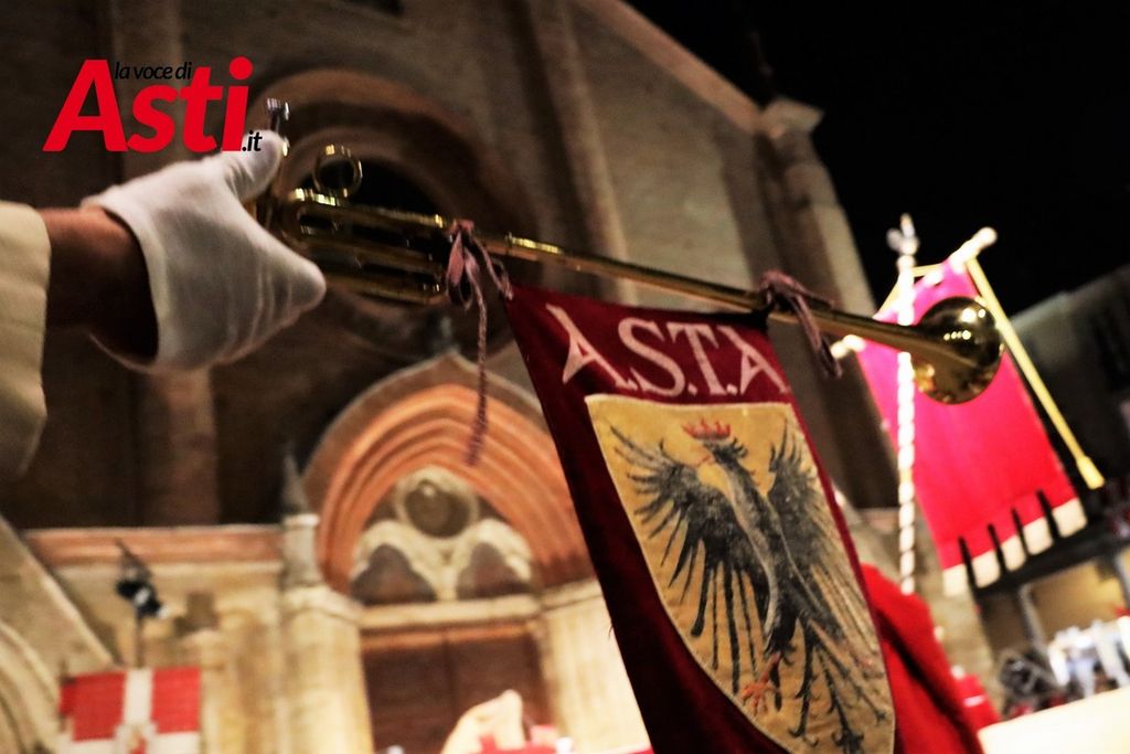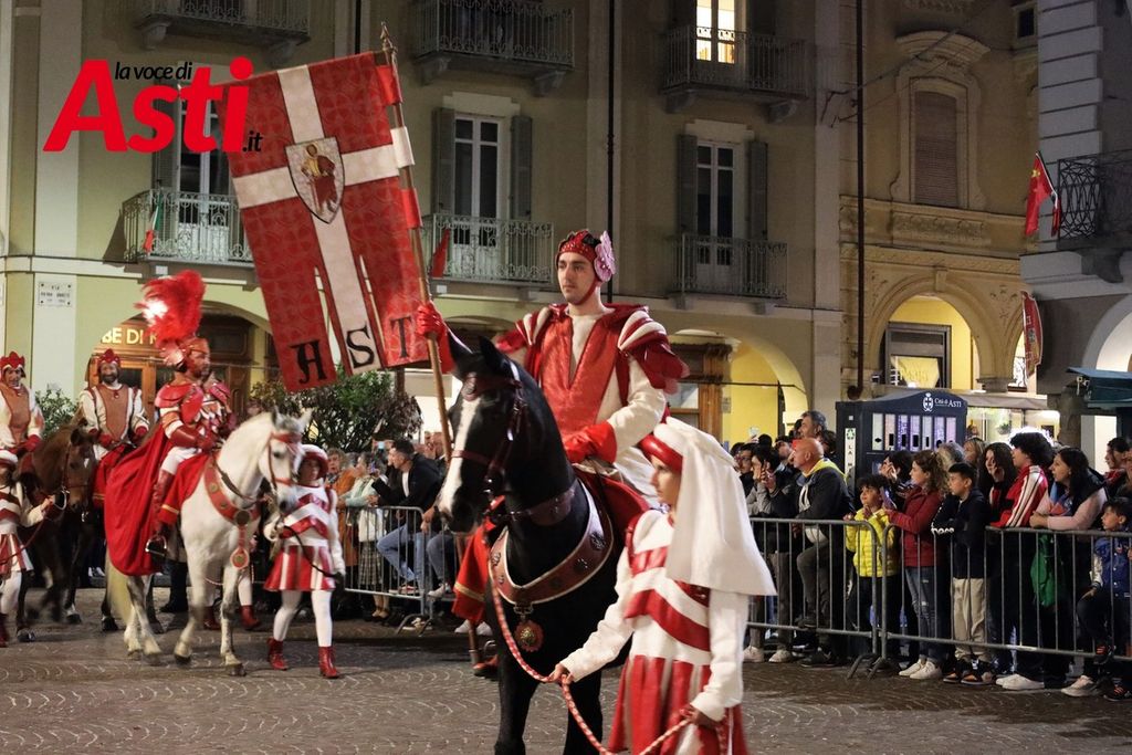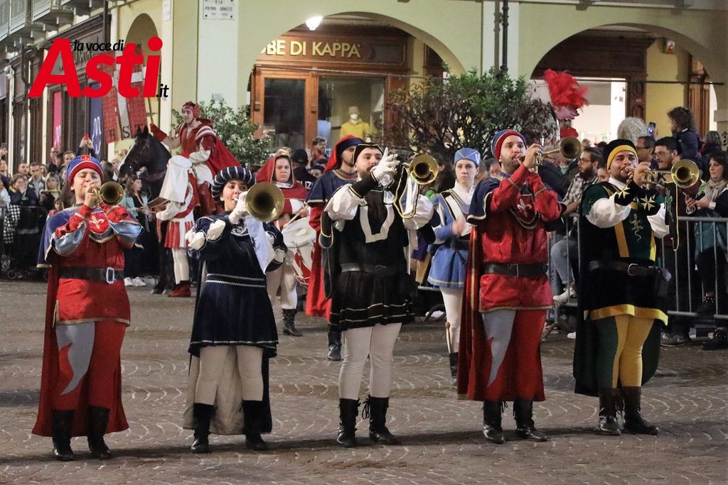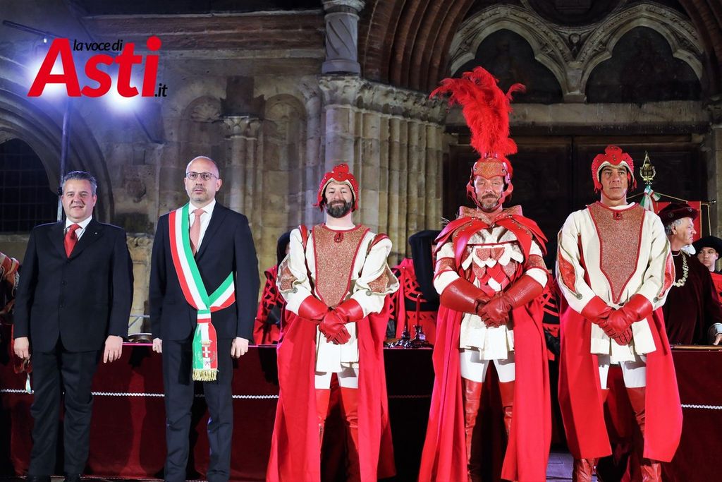 All'arrivo del corteo storico che accompagna la Stima del Palio, hanno fatto la loro comparsa in piazza San Secondo, come da tradizione, i due sendalli del Palio 2023.