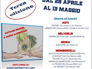 Per il terzo anno il Lions Club Storici, Artisti e Presepisti d’Asti promuove l'iniziativa "Una Spesa… da Leoni" partita sabato 29 aprile che durerà fino al 13 maggio, volta come sempre, a raccogliere e donare alimenti e prodotti di prima necessità al Banco Alimentare di Quarto d'Asti.