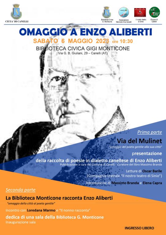 Sabato 6 maggio la Biblioteca Civica G. Monticone ricorda il poeta gentile Enzo Aliberti, scomparso il 12 gennaio 2022. Una giornata, due appuntamenti connessi, per omaggiarlo con emozione e riconoscenza verso il lavoro svolto fianco a fianco con la Biblioteca nel corso negli anni.