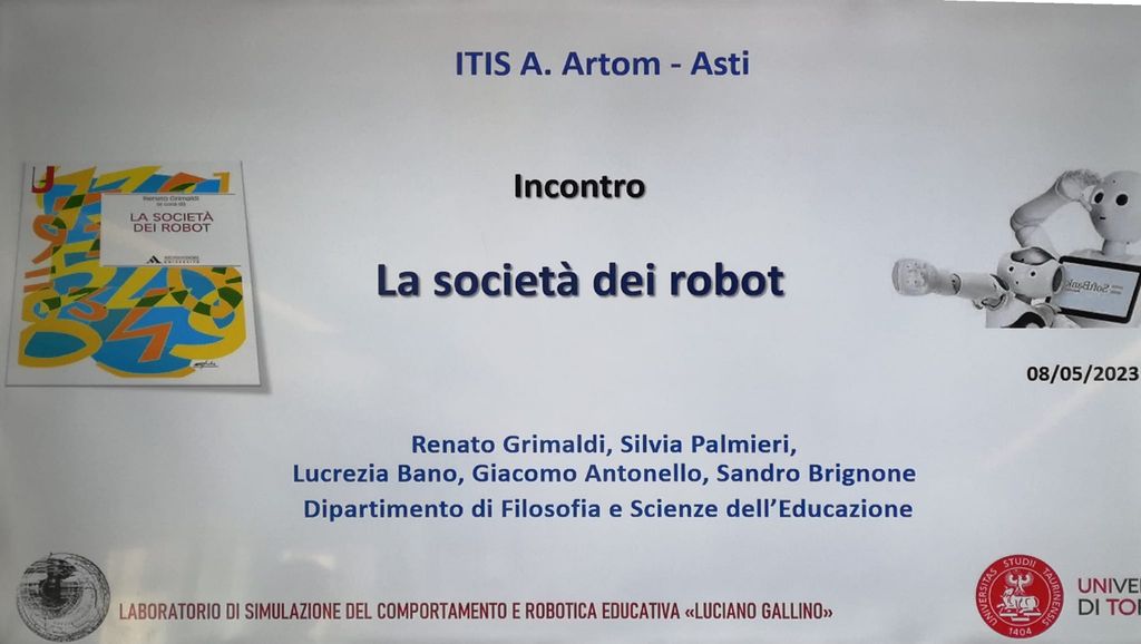 L'8 maggio presso l'Istituto Artom di Asti, in Italia, si è svolta una giornata speciale che ha coinvolto attività teoriche e pratiche per le classi Quarte della sezione Informatica e Meccatronica e gli studenti del secondo anno delle scuole superiori di Asti. Gli studenti dell'istituto sono stati accolti nella sala principale dal professor Renato Grimaldi e dal suo team di ricercatori e collaboratori, tra cui Silvia Palmieri, Lucrezia Bano, Giacomo Antonello e Sandro Brignone. Hanno presentato il Laboratorio di Simulazione e Robotica Educativa comportamentale "Luciano Gallino" del Dipartimento di Filosofia e Scienze dell'Educazione dell'Università di Torino.