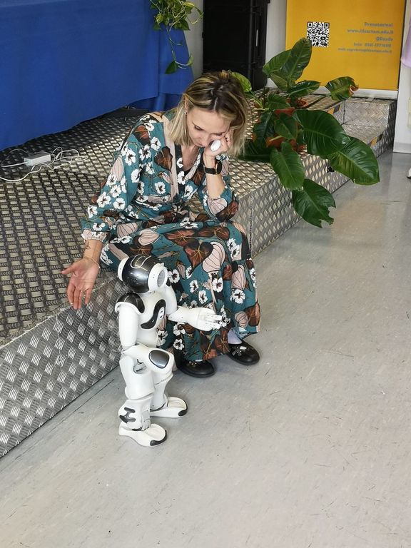 Il professor Grimaldi, che in passato insegnava "Metodi Avanzati di Ricerca Sociale" presso il Dipartimento di Filosofia e Scienze dell'Educazione dell'Università di Torino, ha presentato la sua ultima pubblicazione "La Società dei Robot", che illustra l'evoluzione della robotica dal settore industriale a quello sociale. Man mano che i robot si spostano gradualmente dagli spazi industriali a quelli pubblici e privati, diventano sempre più integrati nella vita umana, e Nao ne è un esempio. Negli ultimi due decenni è emerso il concetto di "robotica sociale" e il libro contiene riflessioni ed esperienze dei principali esperti italiani ed europei di diverse discipline capaci di fornire lo stato attuale della ricerca condotta nei laboratori di robotica più importanti.