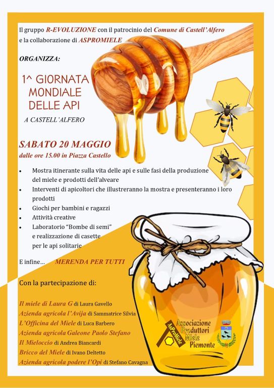 Gli apicoltori che parteciperanno alla manifestazione sono “Il miele di Laura G” di Laura Gavello, “Azienda agricola L’Avija” di Silvia Sammatrice, “L’Officina del Miele” di Luca Barbero, “Il Mieloccio” di Andrea Biancardi, “Bricco del Miele” di Ivano Deltetto, “Azienda agricola Galeone Paolo Stefano”, “Azienda agricola Podere l’Opi” di Stefano Cavagna.
