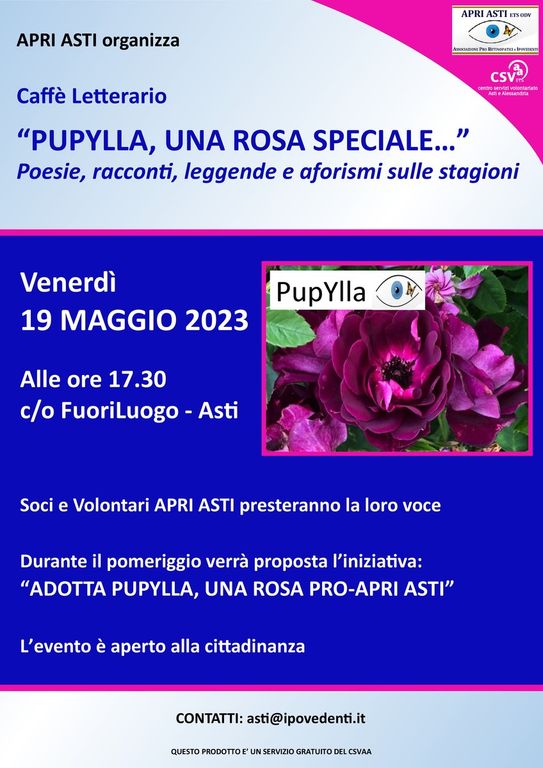 APRI ASTI, l'Associazione per i disabili visivi di Asti, sta organizzando anche quest'anno il suo caffè letterario annuale per promuovere una raccolta fondi per l'iniziativa "Pupylla - Adotta una rosa".