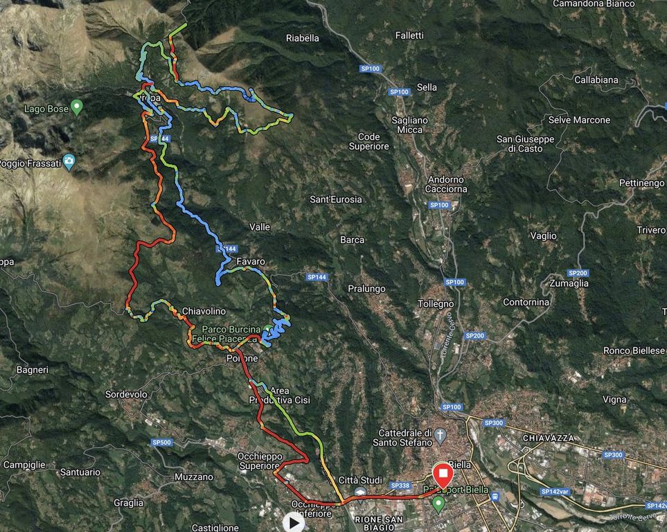 Optiamo per un avvicinamento "morbido" che passa prima dalla Burcina e poi dal "trenino". A Oropa arrivano le prime gocce proprio mentre siamo sotto i portici del Santuario e non prendiamo acqua. Appena smette si sale veloci alla galleria di Rosazza per dare un'occhiata alla Valle Cervo ma il nostro obiettivo è un altro.