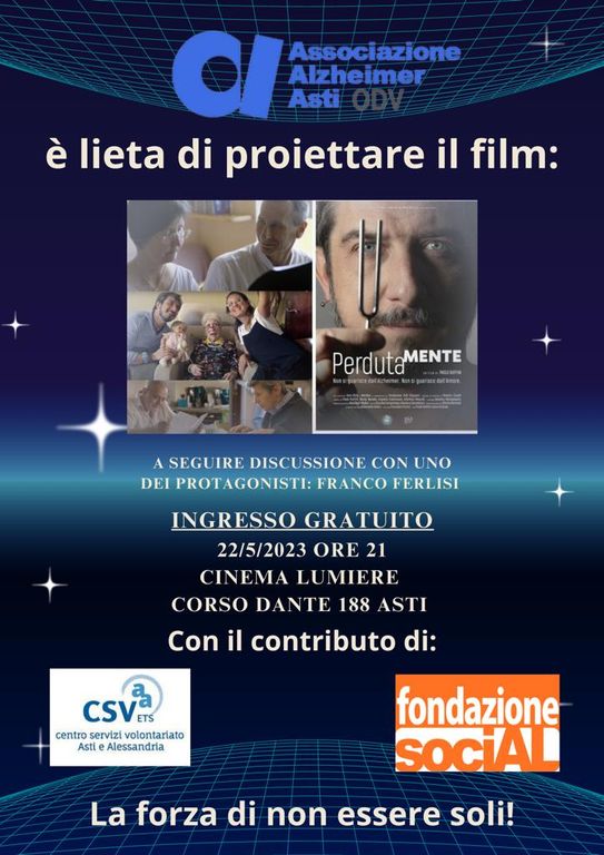 Alle 21 di lunedì sera, 22 maggio, il cinema Lumiere ad Asti (corso Dante 188) sarà il palcoscenico di un evento speciale. Franco Ferlisi, uno dei protagonisti del film "PerdutaMente", si unirà al pubblico astigiano per una proiezione gratuita promossa dall'Associazione Alzheimer di Asti, presieduta da Maria Teresa Pippione, in collaborazione con il CSVAA. Diretto da Paolo Ruffini e Ivana Di Biase, questo documentario offre uno sguardo intimo e coinvolgente sulla malattia di Alzheimer.