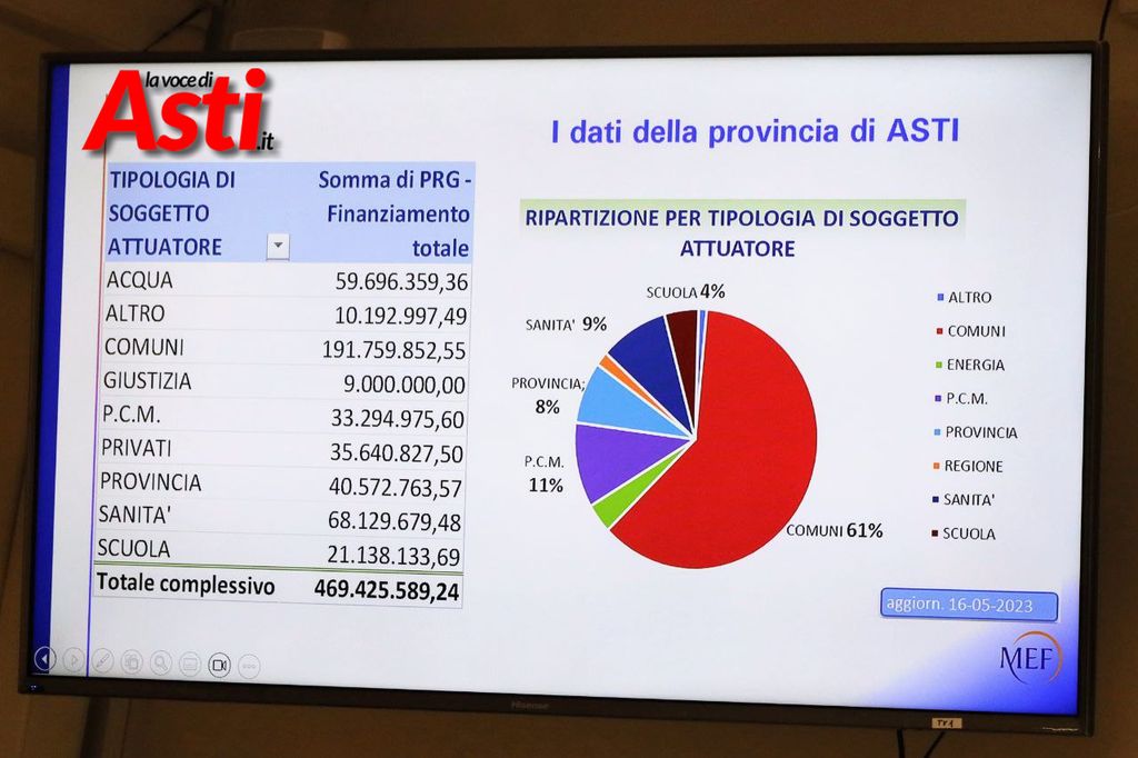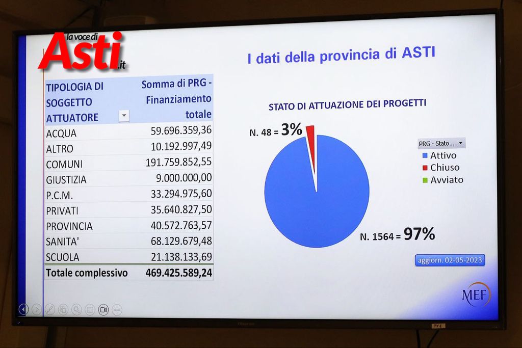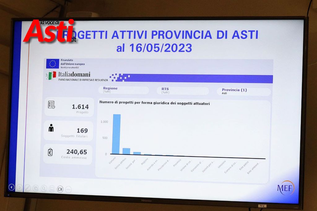 Asti ha 1614 progetti, con 169 soggetti titolari e un costo annesso di 240 milioni di Euro. Il 61% dei soggetti attuatori sono i Comuni.
