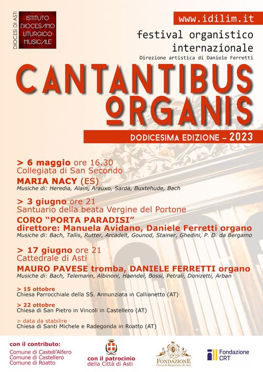 Il secondo concerto vedrà nuovamente l’organo protagonista, nella duplice veste di strumento solista e accompagnatore. L’appuntamento avrà luogo nella Cattedrale di Asti sabato 17 giugno alle ore 21 e i protagonisti saranno Daniele Ferretti all’organo e Mauro Pavese alla tromba. Entrambi astigiani, proporranno un repertorio che attraverserà diversi secoli di opere musicali di comprovata bellezza, con scelte musicali che spazieranno dal ‘700 fino al ‘900 e con autori quali Bach, Haendel, Telemann, Donizetti, Bossi, Arban, Petrali.
