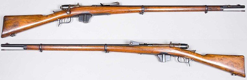 Il fucile in questione, un modello Vetterli-Vitali con il marchio Torino 1877, è un'arma che risale agli anni successivi alla proclamazione del Regno d'Italia, quando fu necessario sostituire il Carcano Mod. 67 ad ago. La scelta cadde sul fucile svizzero Vetterli Modello 1869, prodotto per l'Italia in versione monocolpo. Tuttavia, questa soluzione si rivelò presto inadeguata rispetto ai contemporanei fucili europei, e quindi il Regio Esercito decise di adottare il sistema a ripetizione manuale ideato dal capitano di artiglieria Giuseppe Vitali per i suoi Modello 1870, ottenendo così il Modello 1870/87.