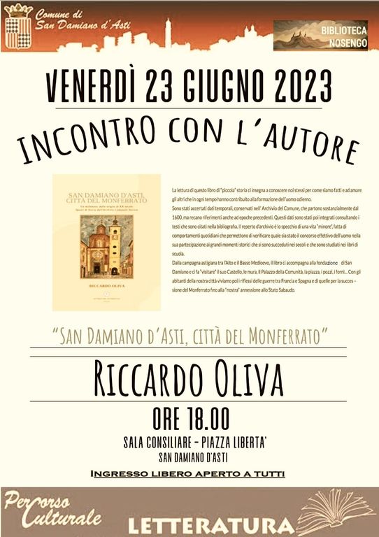 Che si aprirà venerdì, alle 18, con la presentazione del volume “San Damiano d’Asti, Città del Monferrato” di Riccardo Oliva. Secondo volume, dopo quello della compianta maestra Annamaria Cirio, dedicato alla cittadina.