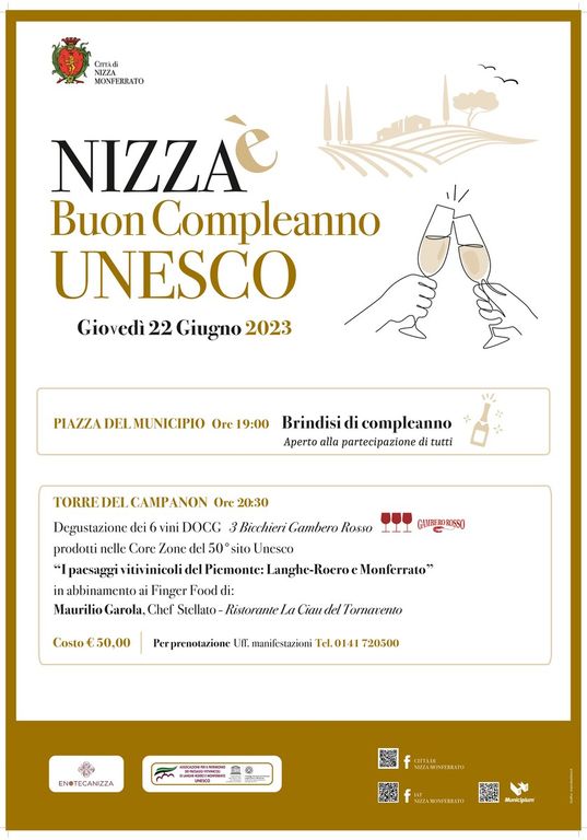 Il vicesindaco Pier Paolo Verri: "Faremo un aperitivo in piazza del Comune con la cittadinanza alle 19. Per poi alle 20:30 fare una degustazione dei 6 vini delle 6 Core zone che più rappresentano la zona unesco. I 6 vini sono quelli che hanno riconosciuto il massimo dal gambero rosso, cioè i tre bicchieri Rossi (tra cui Barolo, Barbaresco, Nizza, Alta Langa e Moscato). Insieme ai 6 vini ci sarà una guida che spiegherà la degustazione accompagnata da 6 cibi di accompagnamento".