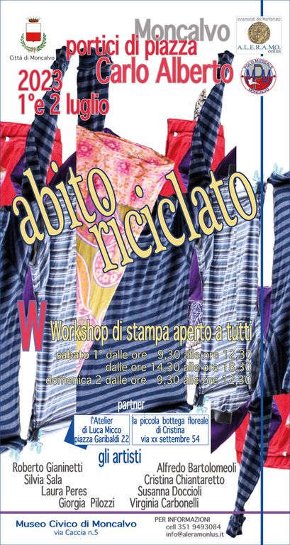 A.L.E.R.A.MO. Onlus propone la residenza d'artista dal titolo "Abitato riciclato", che si svolgerà sabato 1 e domenica 2 luglio. All'evento parteciperanno maestri incisori provenienti da diverse parti d'Italia, tra cui Roberto Gianinetti, Alfredo Bartolomeoli, Silvia Sala, Cristina Chiantaretto, Susanna Doçcioli, Laura Peres, Giorgia Pilozzi e Virginia Carbonelli. L'iniziativa avrà come partner l'Atelier di Luca Micco in piazza Garibaldi 22 e la Piccola Bottega Floreale di Cristina in via XX Settembre 54, dove saranno esposte alcune opere dei maestri incisori che collaborano con A.L.E.R.A.MO. Onlus.