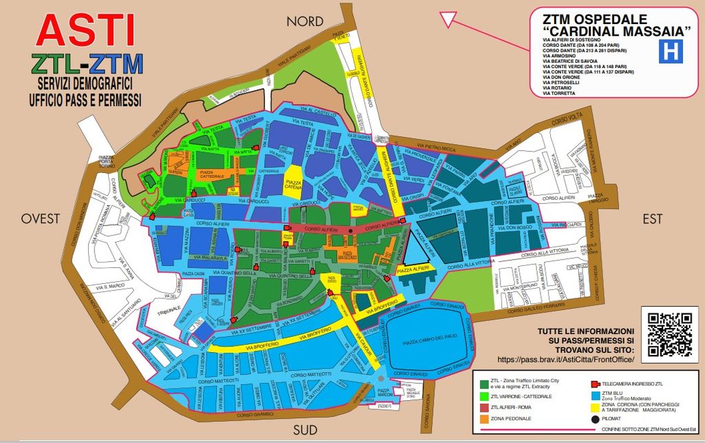 I pass verdi, rossi, blu attività per la nuova zona Varrone/Cattedrale, andranno richiesti in autonomia dai cittadini sulla specifica procedura informatica raggiungibile tramite Qr code, link oppure dal sito internet del Comune di Asti, a partire dall’11 luglio prossimo. I Pass verranno rilasciati in modalità dematerializzata.