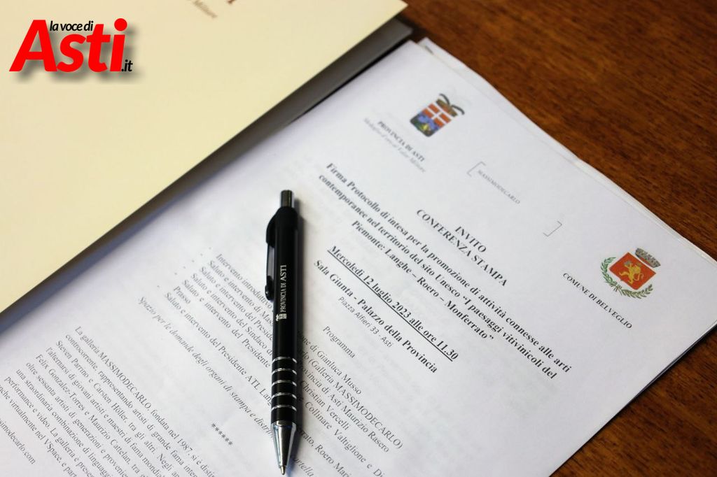 Questa mattina in Provincia, ad Asti, è stato firmato il protocollo d'intesa tra Provincia, Comune di Belveglio, la comunità collinare Val Tiglione e dintorni, l'ente turismo Langhe Monferrato e Roero e il famoso gallerista Massimo De Carlo dell'omonima galleria.