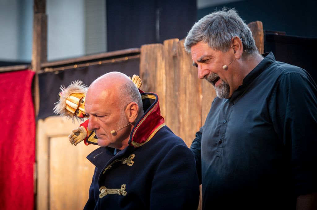 Teatro Invito ha immaginato di ridurre la scena elisabettiana a una baracca di burattini, dove Re Lear, interpretato da un attore in carne e ossa, dialoga con i suoi fantasmi intagliati nel legno.