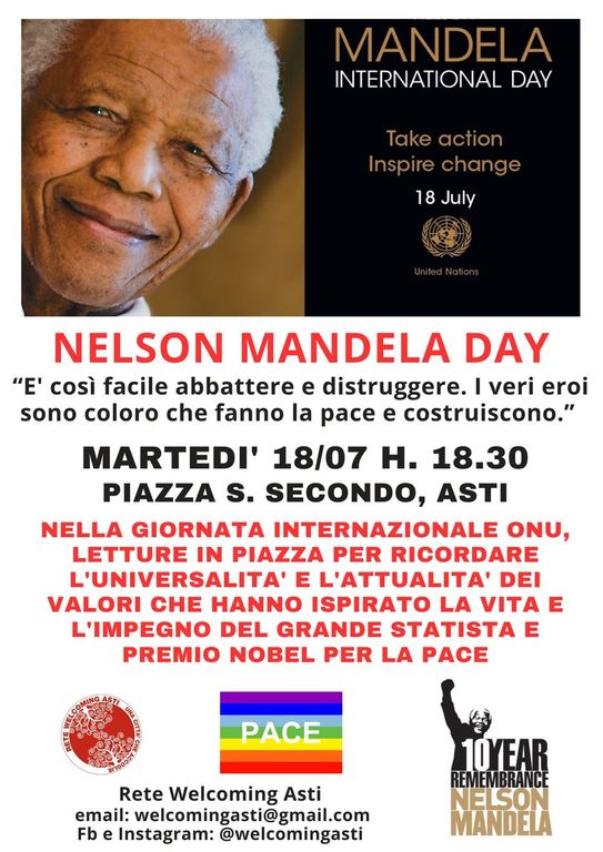 Per celebrare il Nelson Mandela Day e per ricordare i valori che hanno ispirato la vita e l'impegno di questo grande statista e premio Nobel per la Pace, la Rete Welcoming Asti invita tutti a partecipare a una lettura dei suoi testi nel pomeriggio di martedì (appunto 18 luglio) alle 18.30 in piazza San Secondo, ad Asti.