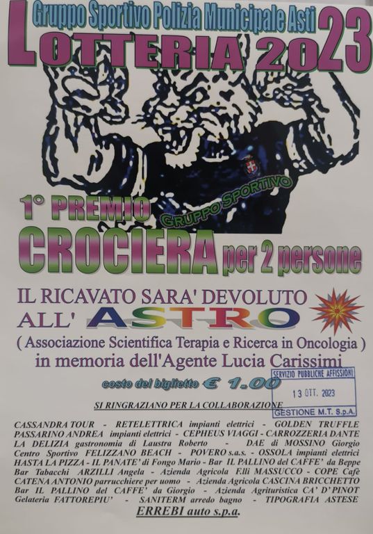 Il dolore per una collega morta a soli 52 anni a causa di un tumore, ha spinto, dal 2007, il gruppo sportivo della polizia locale di Asti ad "inventarsi" una lotteria di beneficenza in sua memoria.