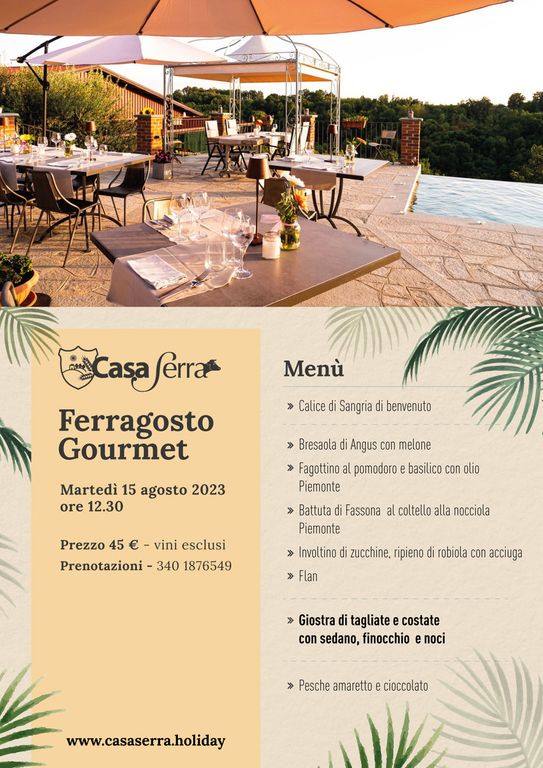 Accompagnati da una vista panoramica sulle colline del Monferrato e da pietanze deliziose, a Ferragosto Casa Serra Eco-Resort & Spa offre un’esperienza esclusiva e indimenticabile che ruota attorno a ottimi piatti della cucina piemontese rivisitati in modo raffinato e originale. Si comincia con un calice di Sangria di benvenuto e, a seguire, bresaola di Angus con melone; fagottino al pomodoro e basilico con olio Piemonte; battuta di Fassona al coltello alla Nocciola Piemonte; involtino di zucchine, ripieno di robiola con acciuga; flan di verdure di stagione con fonduta; giostra di tagliate e costate con sedano, finocchio e noci; pesche amaretto e cioccolato. Il percorso, accompagnato dalla musica dal vivo, è offerto al prezzo speciale di 45 euro, vini esclusi, ed è riservato a un numero limitato di persone. Per partecipare all’evento, lontano dalla frenesia di tutti i giorni e immersi nello splendido scenario della riserva naturale paleontologica di Valleandona, Valle Grande e Val Botto, è necessario chiamare il 3401876549.
