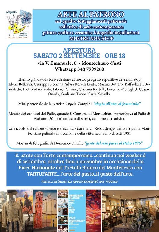 Si inizierà sabato 2 settembre con Arte al Patrono in occasione della festa patronale di Montechiaro, un mese espositivo all'insegna dell'arte figurativa, nel cenacolo dell'arte montechiarese, Art Palio di via Vittorio Emanuele, 8.