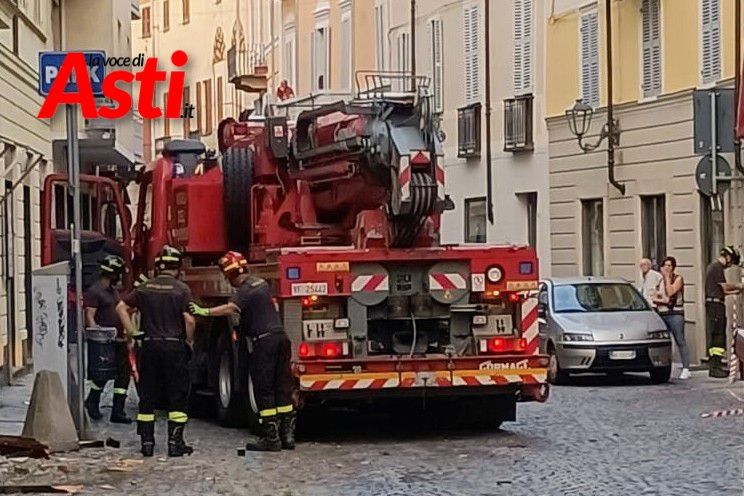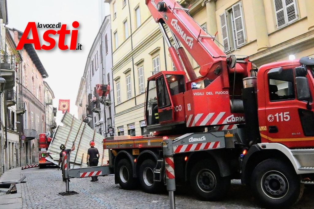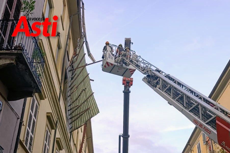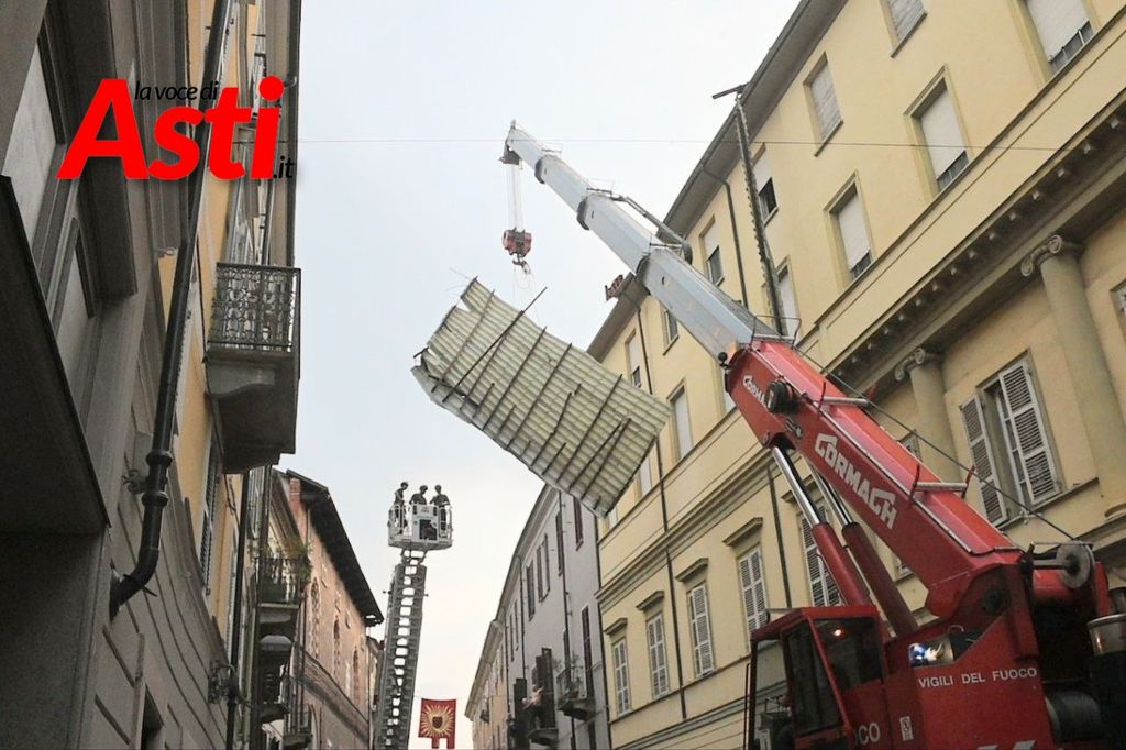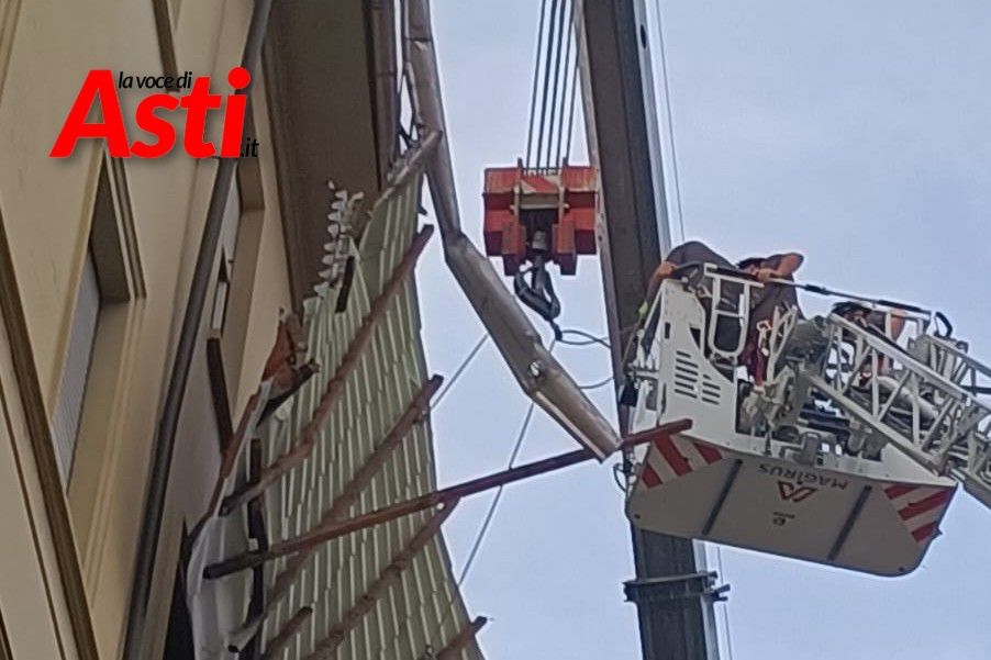 Intervento spettacolare in via XX Settembre ad Asti dove per rimuovere una tettoia pericolante c'è stato bisogno di utilizzare una gru