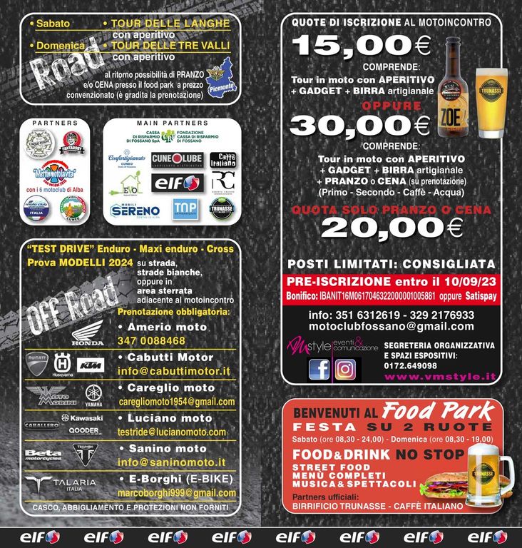 Sabato 16 settembre alle 8,30 è prevista l’apertura delle iscrizioni, degli stand e del Food Park. Alle 10 il primo appuntamento in programma è un tour nelle langhe in moto con aperitivo lungo il percorso e rientro per il pranzo convenzionato al Food Park, l’area ristorazione ufficiale allestita dal Pala CRF in Piazza Don Gerbaudo. In collaborazione con Caffè Italiano e il birrificio Trunasse, il Food Park apre da sabato mattina fino a domenica sera: street food, menù completi, birra artigianale e tanta musica.