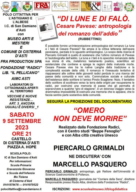 “Si può dare un’interpretazione antropologica di La luna e i falò di Pavese dove parziale è lo sguardo antropologico. Grimaldi con la sua ricerca sostiene che l’ultimo romanzo di Pavese è l’autobiografia dell’addio. La luna e i falò è lo specchio romanzato della sua storia di vita, metaforico testamento poetico, scientifico ed esistenziale che contiene e spiega le ragioni della maturata morte. Pavese vive tra le native Langhe della tradizione e la complessità sociale della città. Il romanzo è l’inesausto tentativo di riappaesarsi alle colline delle giovanili radici perdute in una ricerca del paese della comunità e non solo. Commutatore sociale e culturale dell’esistenza dello scrittore è l’amico Pinolo Scaglione: Nuto. Il tentativo dello scrittore di scollinare verso la terra delle origini per recuperarne le radici, per costruirsi una memoria di paese che gli permetta di sopravvivere a qualche “giro di stagione”, è un doloroso viaggio verso la drammatica impossibilità di costruire una memoria che lo appaesi, che lo faccia sentire parte sostantiva della comunità”. Seguirà la proiezione del documentario “Omero non deve morire” realizzato dalla Fondazione “Radici” con il Centro studi “Beppe Fenoglio” e con Alba città creativa Unesco. Come hanno sottolineato gli autori, scopo della ricerca è raccontare la Langa della Malora di Beppe Fenoglio a partire dall’inizio del Novecento per giungere a quella vissuta dallo scrittore nel secondo dopoguerra: terra grama, lontana dalla ricchezza della Langa del Barolo, un passato da ricordare. La ricerca intende recuperare un patrimonio culturale che sta scomparendo dalle nostre terre perchè Omero non deve morire. Piercarlo Grimaldi ne discuterà con il giornalista del Corriere della Sera Marcello Pasquero, direttore dell’ Ass. “Radici”. L’incontro è organizzato da Polo Cittattiva per l’Astigiano e l’Albese – I.C. S. Damiano, Museo Arti e Mestieri di un Tempo di Cisterna con Fra Production Spa, Fondazione “Radici” Libreria "Il Pellicano" e Aimc di Asti. L’ incontro è gratuito, aperto a tutti e valido per l’aggiornamento degli insegnanti.