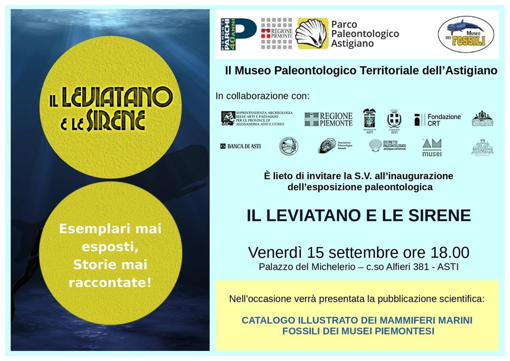 Verrà inaugurata venerdì 15 settembre alle 18 "Il Leviatano e le Sirene", la nuova esposizione al Museo Paleontologico Territoriale dell'Astigiano,  che presenta una delle più importanti collezioni di fossili di cetacei in Europa, con reperti unici al mondo.