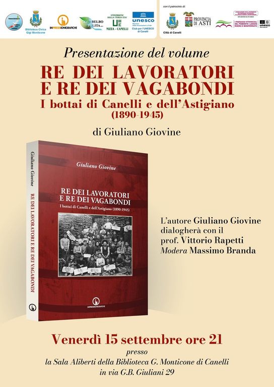Per Canelli, il periodo dorato della vendemmia è quest’anno propizio per ripercorrere la storia e il costume dei suoi mitici bottai. L’occasione sarà la prima presentazione del libro di Giuliano Giovine, Re dei lavoratori e re dei vagabondi - I bottai di Canelli e dell'Astigiano (1890-1945) edito da Impressioni Grafiche: venerdì 15 settembre, alle 21, nella Sala Aliberti della Biblioteca G. Monticone in via G.B. Giuliani 29.