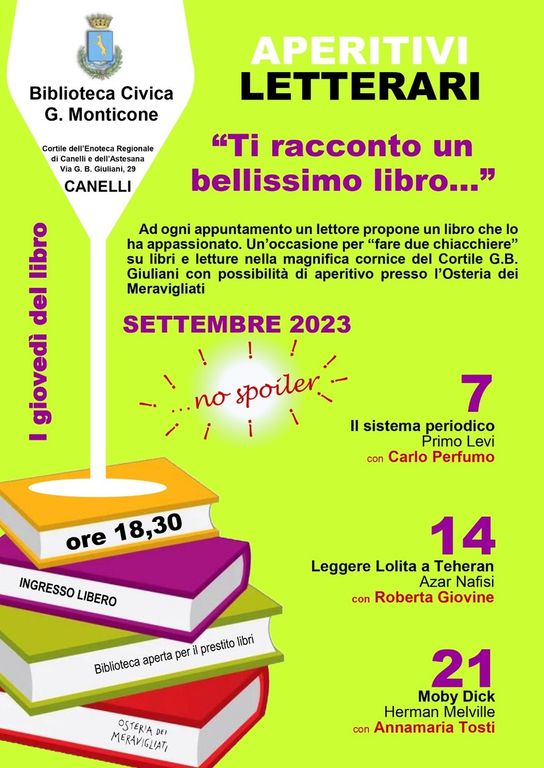 Appuntamento il 14 settembre, alle 18.30, sotto l’albero nel cortile dell’Enoteca Regionale o, in caso di maltempo, nei locali della Biblioteca al secondo piano in Via G.B. Giuliani 29, a Canelli.