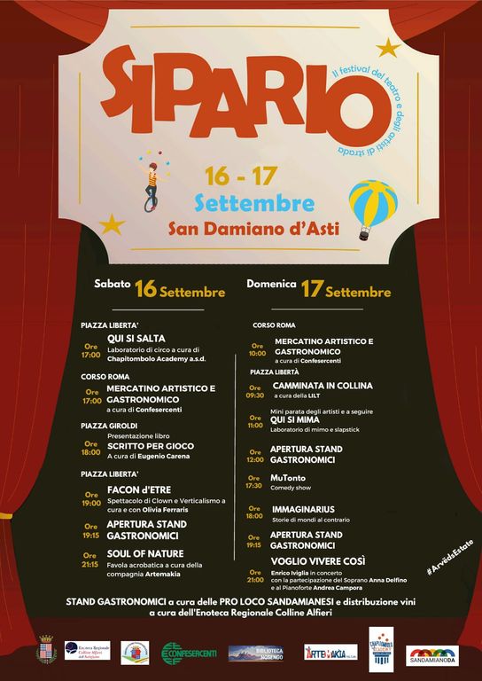 Sabato 16 e domenica 17 settembre, a San Damiano d'Asti, si terrà la quinta edizione di "Sipario", un evento che accenderà le piazze e le strade della città con artisti di strada e spettacoli. La magica atmosfera musicale e circense inizierà alle 17 di sabato, con acrobati, giocolieri e prestigiatori che si esibiranno nella centrale Piazza Libertà e nelle vie del paese.